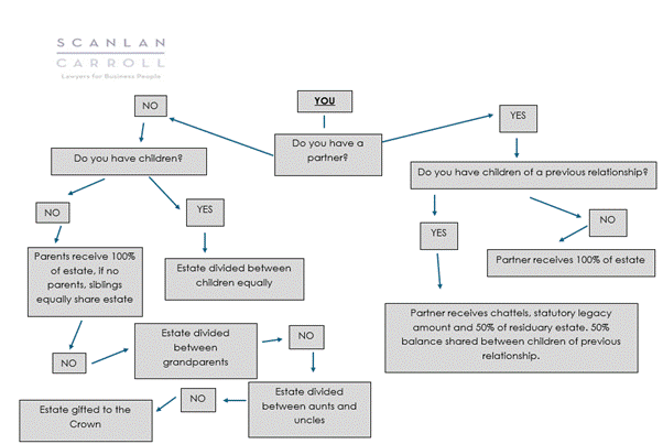 If an individual passes away without a will, there is a cascading process to determine who is most entitled to benefit from the deceased’s estate.